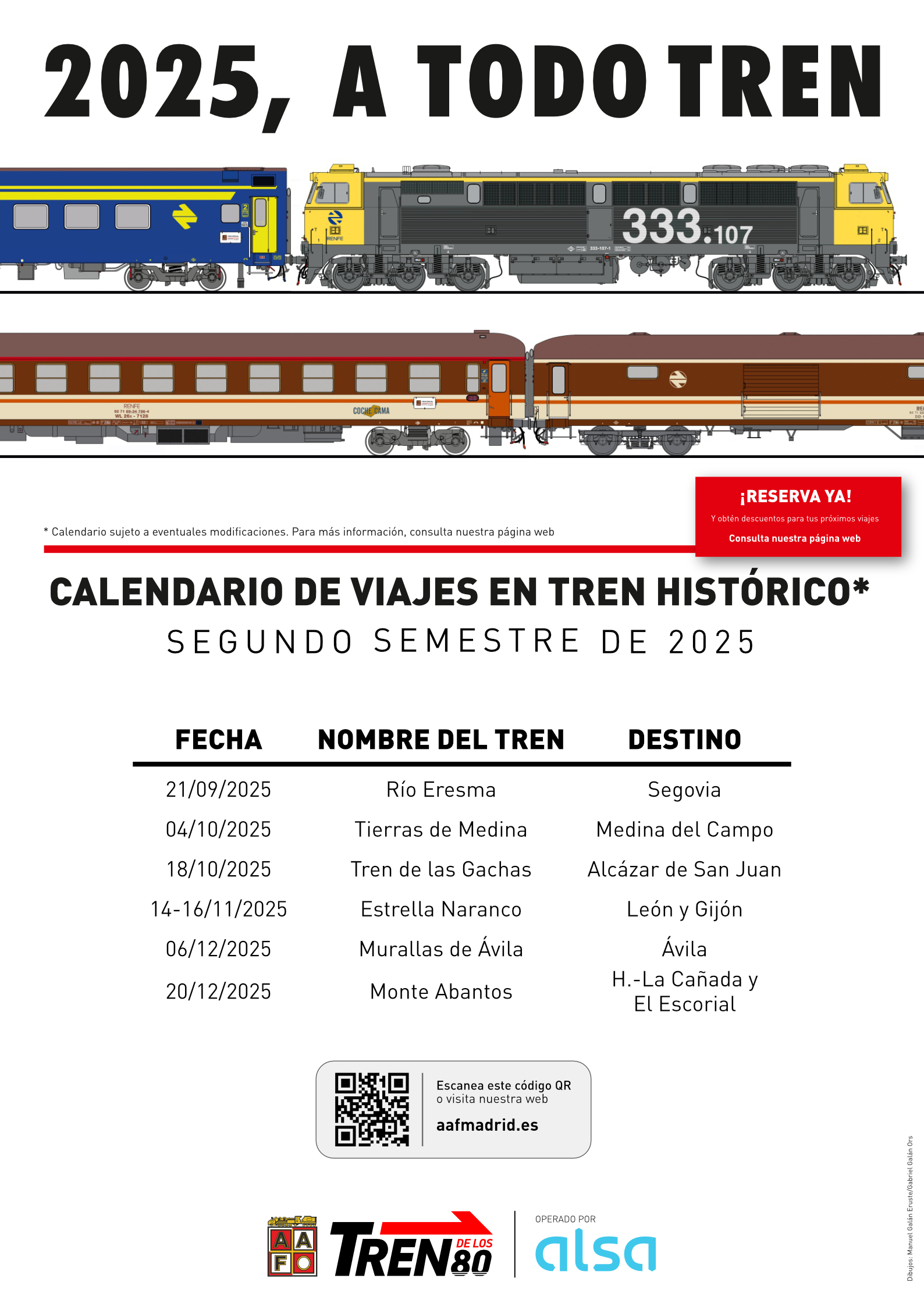 Tras el verano, vuelve la emoción de viajar en tren histórico. Desde la Asociación de Amigos del Ferrocarril de Madrid, en colaboración con Alsa, tenemos el placer de presentar el calendario de salidas a bordo del Tren de los 80 para la segunda mitad de 2025.